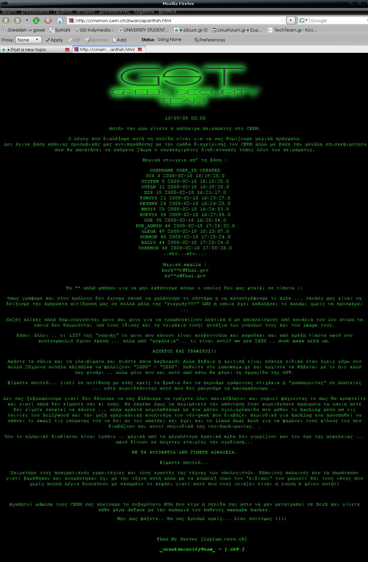 Um grupo de cracking denominado “Greek Security Team” (GST) assumiu a responsabilidade do ataque. Os sistemas de controle da máquina não foram penetrados, mas uma página web no servidor localizado no endereço cmsmon.cern.ch foi alterada.