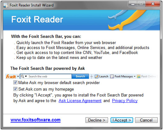 O FoxIt Reader, um leitor alternativo de arquivos PDF, é um exemplo. Ele instala o “FoxIt Search Bar Powered by Ask”, que nada mais é que o Ask Toolbar. Para evitar a instalação completa do Ask, é um pouco complicado. Além de desmarcar as caixas na tela, é preciso clicar em Decline (Recusar). Quem só clicar em Decline terá a página principal e o provedor de pesquisa do navegador alterados. Quem só desmarcar as caixas e clicar em I Accept receberá a barra de ferramentas.