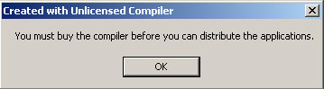 A mensagem afirma que o programa foi criado com uma versão não licenciada do compilador. O compilador é o programa responsável por transformar o código do software em linguagem binária que o computador consegue compreender. É normal que o software funcione na máquina do criador do vírus – porque ele tem o compilador instalado -, mas o mesmo não vai acontecer quando a praga for distribuída.
