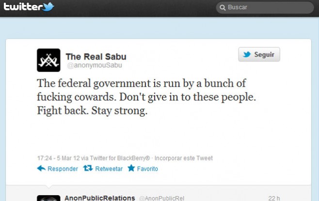 Em mensagem no Twitter publicada um dia antes de Sabu ser revelado como informante, hacker afirma que o governo 'é controlado por um bando de covardes. Lute e fique firme.' (Foto: Reprodução)