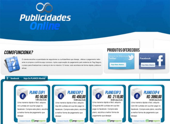 No PublicidadesOnline.net, cem mil “curti” podem custar R$ 3.990, enquanto mil “curti” custam apenas R$ 50.