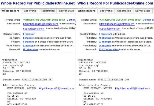 Há dois sites envolvidos: PublicidadesOnline.com e PublicidadesOnline.net. A venda ocorre no site PublicidadesOnline.net, enquanto algumas das referidas extensões ficam no PublicidadesOnline.com. Os dois sites foram registrados no mesmo dia, estão em nome da mesma pessoa e hospedados no mesmo endereço IP [1. Desde a edição da reportagem, o PublicidadesOnline.com mudou de endereço IP.].
