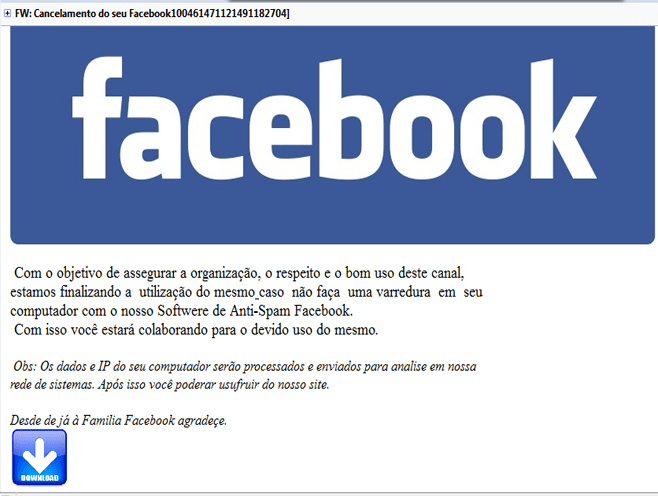 A equipe da Linha Defensiva recebeu recentemente, através de uma denuncia ao ARIS, um email que imita uma mensagem como sendo do Facebook. O email trata de um suposto cancelamento de conta na rede social. O golpe leva a vítima para o download de um arquivo malicioso que rouba senhas bancárias.