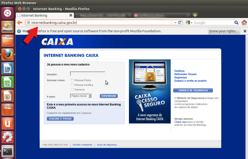 Paulo, que teve o seu modem comprometido, acessa o Internet Banking do seu banco (Caixa Econômica Federal). Observem a página na imagem abaixo: