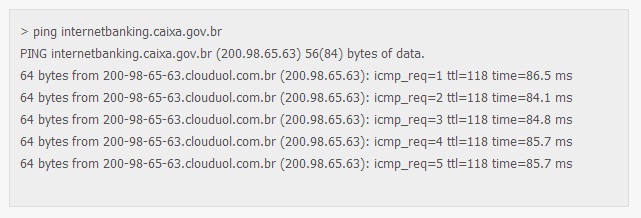 Observamos na imagem acima que na resposta do comando ping existe um endereço do tipo “.clouduol.com.br”. Isso não parece estranho? Como que ao executar um comando ping para o endereço “internetbanking.caixa.gov.br” na resposta aparece um “.clouduol.com.br”?