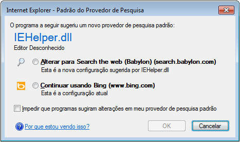 Janela confirma mudança do provedor de busca do Internet Explorer.