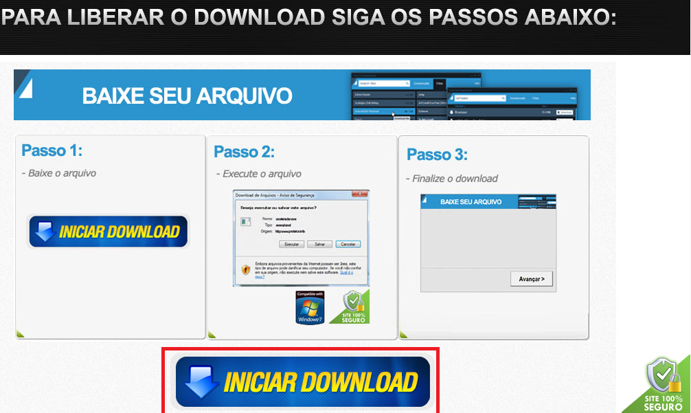 Tente observar bem a página inteira. Normalmente, o botão de download verdadeiro não é o primeiro que aparece na página.