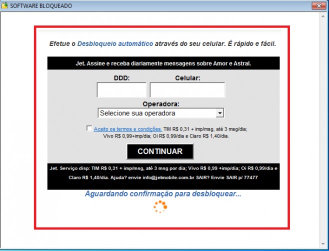 Finalmente, instalador diz que internauta precisa realizar o cadastramento em um serviço de celular de horóscopo para desbloquear o software.