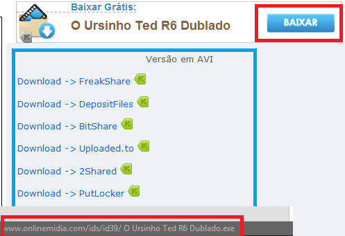 Site tem diversos links de download em menos destaque do que o botão que leva a um conteúdo diferente do prometido – um arquivo executável.