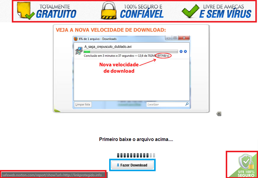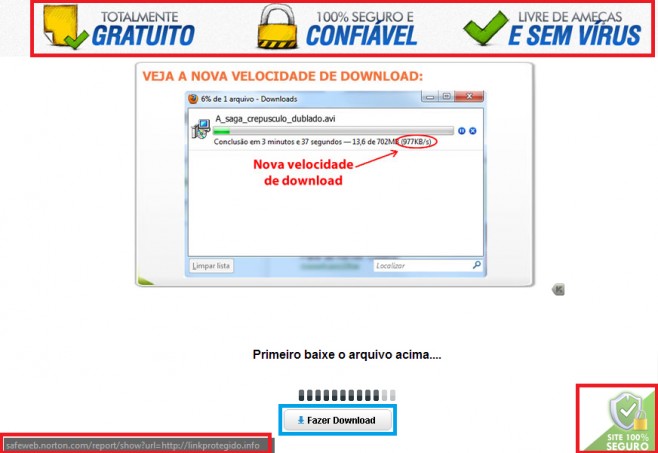 Site com botão falso de download tem símbolo de segurança que leva à verificação de um site diferente do link de download.