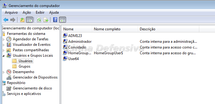 A conta ADM123 é oculta, pertence ao grupo local e ao grupo “Usuários da Área de Trabalho Remota” mas não cria uma pasta de perfil de usuário e não é visível no Painel de Controle nem na tela de logon. Ela só é visível através do comando net user ou em Ferramentas do Sistema > Usuários e Grupos Locais.