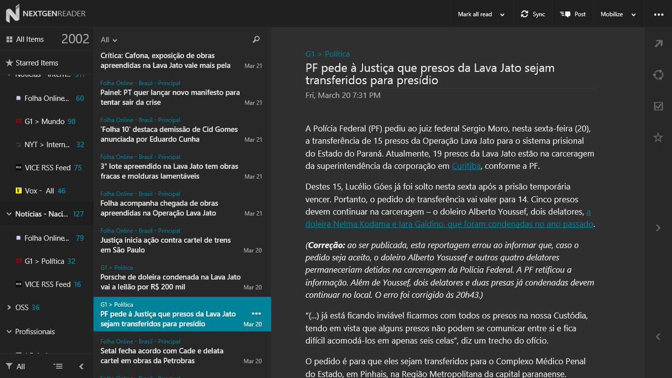 O Nextgen Reader é integrado ao também excelente Readability para visualizar artigos dentro do próprio aplicativo. Não funciona sempre e alguns textos podem não ser exibidos corretamente, mas a leitura das notícias fica bem mais rápida, pois não é preciso sair do app para acompanhar dezenas ou centenas de sites.