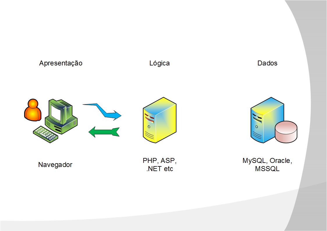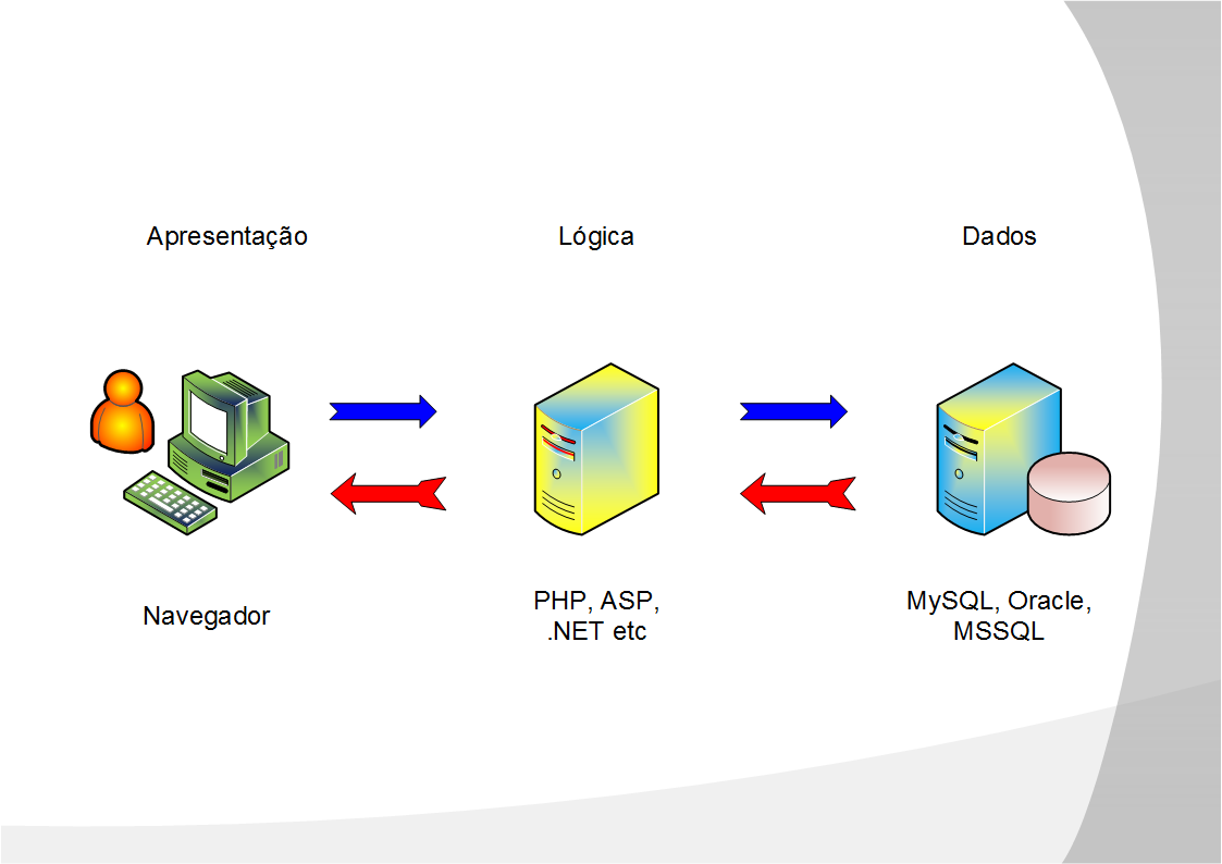 Podemos ver que o usuário está na camada de Apresentação. Quando ele faz a requisição da imagem ela é passada para camada Lógica, onde temos a codificação feita em PHP, ASP etc. A camada Lógica envia esta requisição (consulta) para o banco de dados, que por sua vez retorna para a camada Lógica, a qual envia novamente para o usuário.